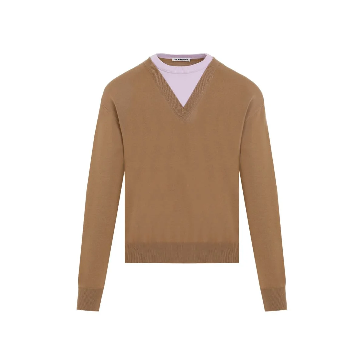 Jil Sander Brown Virgin Wool Pullover. Brown virgin wool-blend, crew neck with double collar effect, dropped shoulder, long sleeves, fine ribbed collar, cuffs and hem. Gender: Men Material: 80%VIRGIN WOOL 20%POLYESTER Color: Beige Made in: IT Product ID: J22GP0213.J14717_243 *Import tax/duty will be calculated at checkout (If applicable)