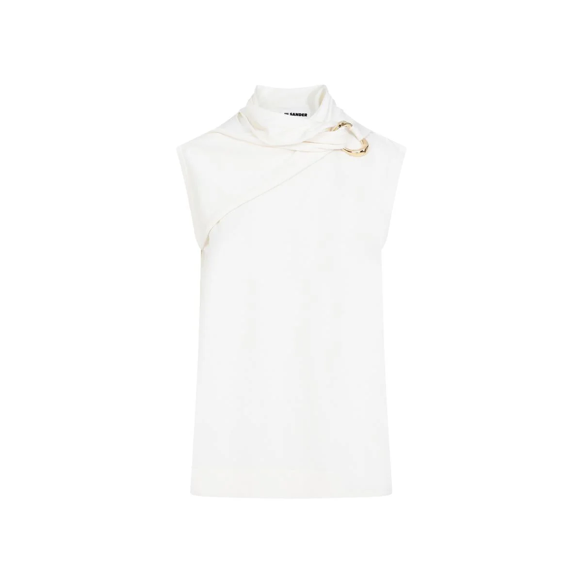 Jil Sander Draped Knitted Coconut Virgin Wool Tank Top. White virgin wool, turtle neck with draped effect and gold-tone metal ring detail, sleeveless, straight hem. Gender: Women Material: 100%VIRGIN WOOL Color: WHITE Made in: IT Product ID: J01NC0136.J14699_104 *Import tax/duty will be calculated at checkout (If applicable)
