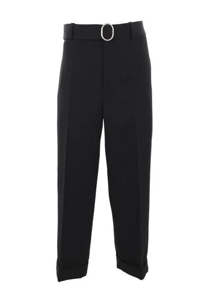 Jil Sander's loose-fit trousers crafted in black wool gabardine. Featuring hook / button / zip closure, belt loops, matching belt, multiple pockets and turn-up hem. Partial lined interior. Gender: Men Material: TESSUTO PRIMARIO: 100% WOOL - LINING: 100% VISCOSE - LINING TASCHE: 100% COTTON Color: Black Made in: IT Product ID: J22KA0230J40002001 *Import tax/duty will be calculated at checkout (If applicable)