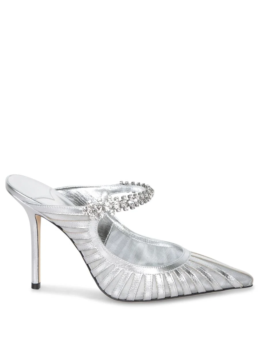 High and slim-heeled mules. Features a silver mesh structure with sparkling finishes and a jewel detail on the band.. These elegant Jimmy Choo Bing 100 mules are the epitome of luxury and sophistication. Their silver metallic mesh structure, adorned with jewel details, makes them perfect for special occasions Gender: Women Material: 82% LEATHER 5% SALPA 5% PLASTIC 5% METAL 3% CRYSTALS Color: GREY Made in: Imported Product ID: J000175920 AA0009 *Import tax/duty will be calculated at checkout (If applicable)