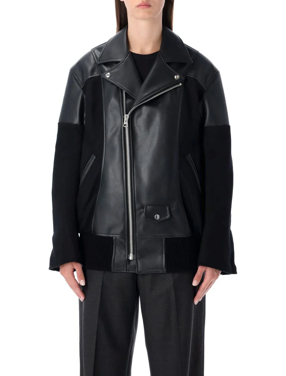 A contemporary reinterpretation of the biker jacket, this Junya Watanabe design blends synthetic leather with soft wool panels for a sophisticated contrast of textures. Featuring an asymmetric zip closure, structured lapels, and ribbed details, it embodies urban edge and refined craftsmanship. The versatile silhouette makes it ideal for layering, adding bold character to modern daywear. Asymmetric front zip fastening Side welt pockets Snap button flap pocket Ribbed hem and cuffs Alessandra is 1,75 m and wears size M Gender: Women Material: 100% SYNTHETIC LEATHER SURFACE 100% POLYURETHANE ATTACHED PART 100% WOOL LINING 100% CUPRO PADDING 100% POLYESTER Color: Black Made in: Imported Product ID: 25AJPJ005051#1 *Import tax/duty will be calculated at checkout (If applicable)