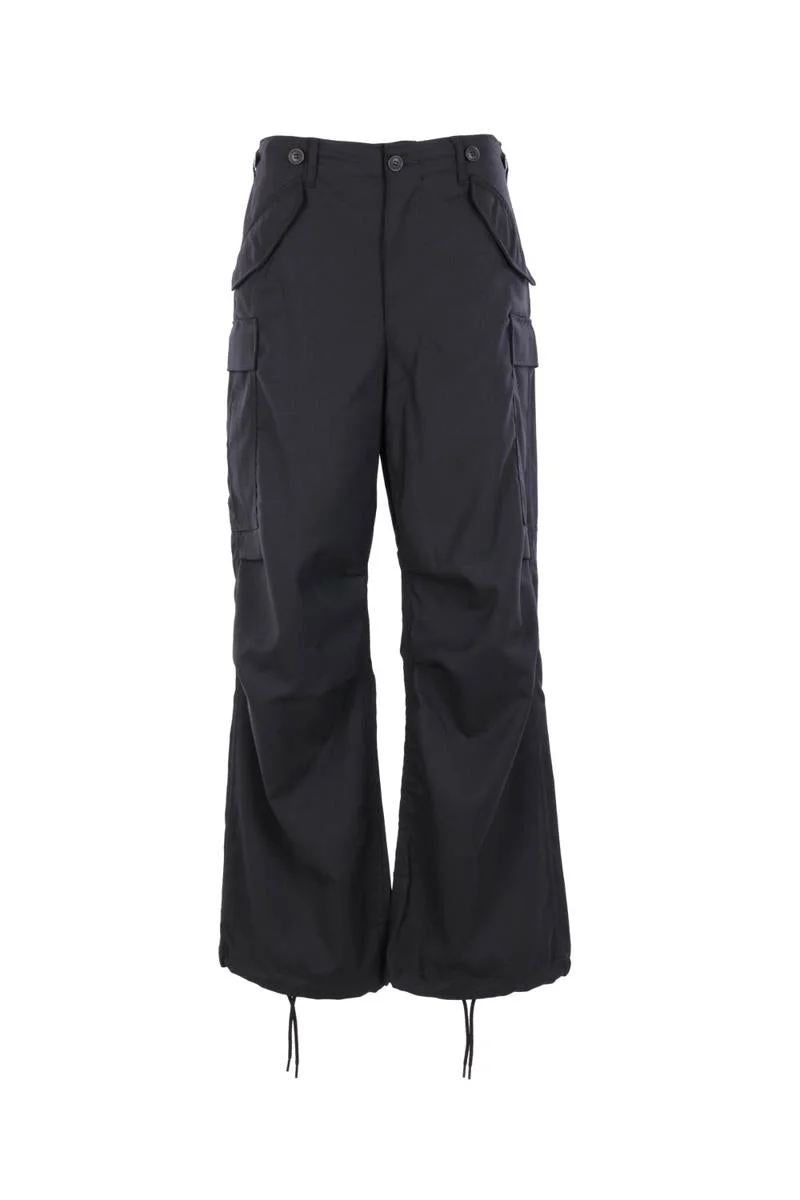 Junya Watanabe cargo trousers crafted from a black wool blend. Featuring front button and zip fastening, belt loops, adjustable tabs at the waist, multiple pockets, and drawstrings at the hem. Gender: Women Material: WOOL 50% POLYESTER 50% Color: Black Made in: Imported Product ID: JPP048W251BLACK *Import tax/duty will be calculated at checkout (If applicable)