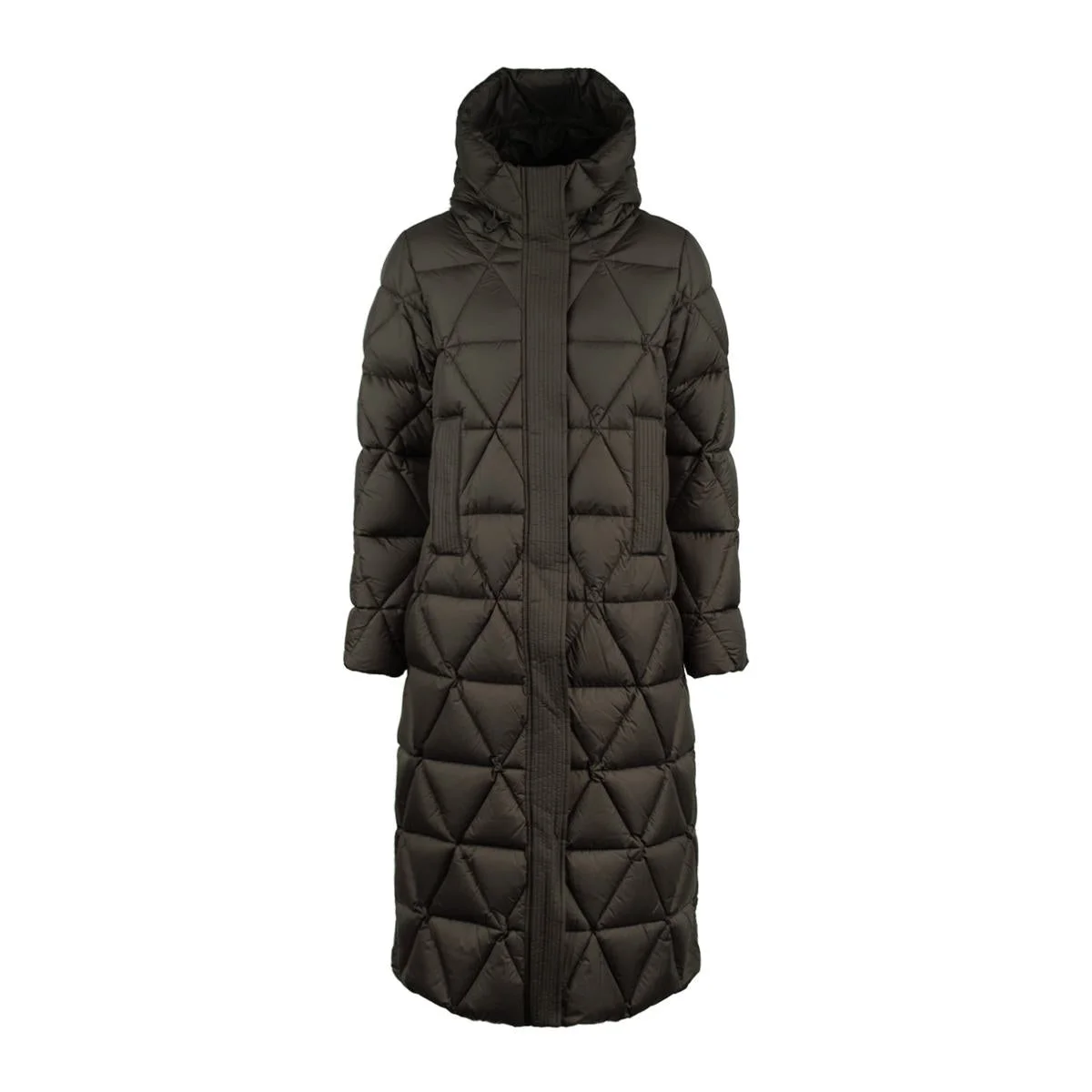 Color Article: Black olive combo | Ruenne is a long, padded women's jacket with a city look | Designed to cope with the harshest weather thanks to its lightweight, water-repellent, quilted fabric and Molina down filling, provides excellent protection from the cold and low weight | Down jacket features a wrap-around hood and zipper closure with quilted flap like pockets | Water-repellent and windproof fabric | Real Molina down filling | High degree of warmth | Adjustable high collar with drawstring | Wrap-around hood | Zip closure and flap cover2 pockets with snap buttons | Regular fit | K-Way tape insert in sleeve bottom | Outer: 100% Polyester | Lining: 100% Polyester | Filling: 90% Duck Down, 10% Duck Down Gender: Women Material: SYNTHETIC MATERIALS Color: BLACK, GREEN Made in: Italy Product ID: K7136JW *Import tax/duty will be calculated at checkout (If applicable)