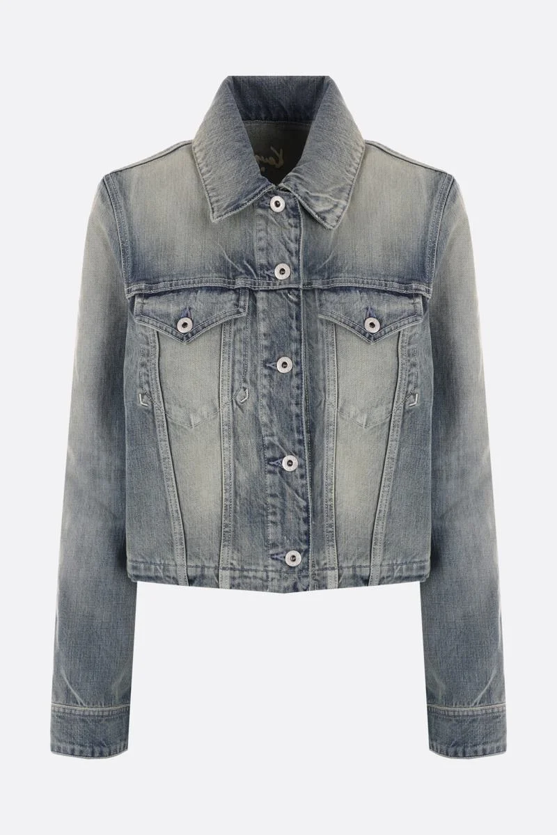 Kenzo's slightly cropped trucker jacket crafted in stone-washed light blue japanese denim with KENZO Archive logo embroidery at back. Featuring pointed collar, metal button closure, long sleeves with buttoned cuffs, front pockets and straight hem. Unlined interior. Gender: WOMEN Material: 100% COTTON Color: BLUE Made in: TN Product ID: FE52DV2456I7DY *Import tax/duty will be calculated at checkout (If applicable)