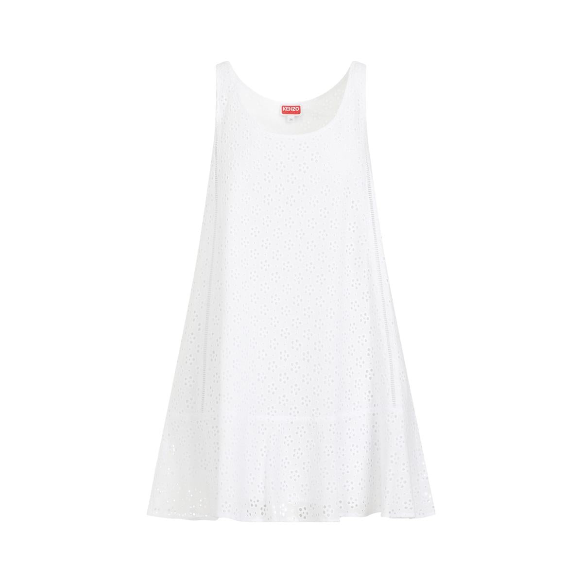Kenzo Broderie Anglaise White Cotton Mini Dress. White cotton broderie anglaise, round neck, sleeveless, branded label at back collar, tonal flounce at the edge, flared, cotton lining. Gender: Women Material: 97%COTTON 3%POLYESTER Color: WHITE Made in: MADAGASCAR|MG Product ID: FE52RO2599K1_02 *Import tax/duty will be calculated at checkout (If applicable)