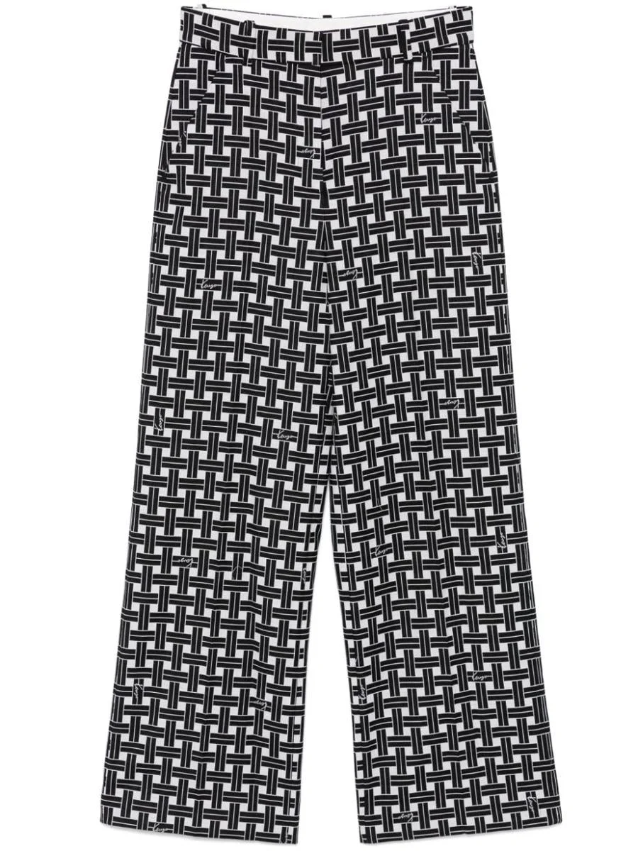 white/black Kenzo Weave pattern concealed front button, hook and zip fastening belt loops two diagonal pockets to the sides pressed crease two rear welt pockets straight leg Gender: Women Material: POLYESTER 57% COTTON 40% ELASTANE 3% Color: WHITE Made in: RO Product ID: FE62PA0949JS 01 *Import tax/duty will be calculated at checkout (If applicable)