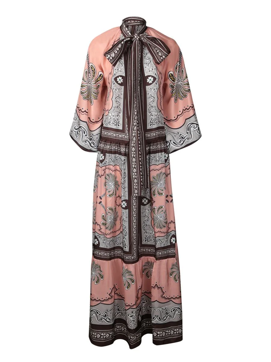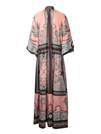 Long dress with intricate print, bell sleeves, and neck bow. This elegant dress from LA DOUBLE J features a captivating design with a vivid paisley print. The neck bow detail adds a touch of sophistication, while the wide bell sleeves ensure an aura of grace and comfort. Gender: Women Material: 100% SILK Color: PINK Made in: Imported Product ID: DRE0618 SIL009AGE0 PI01 *Import tax/duty will be calculated at checkout (If applicable)