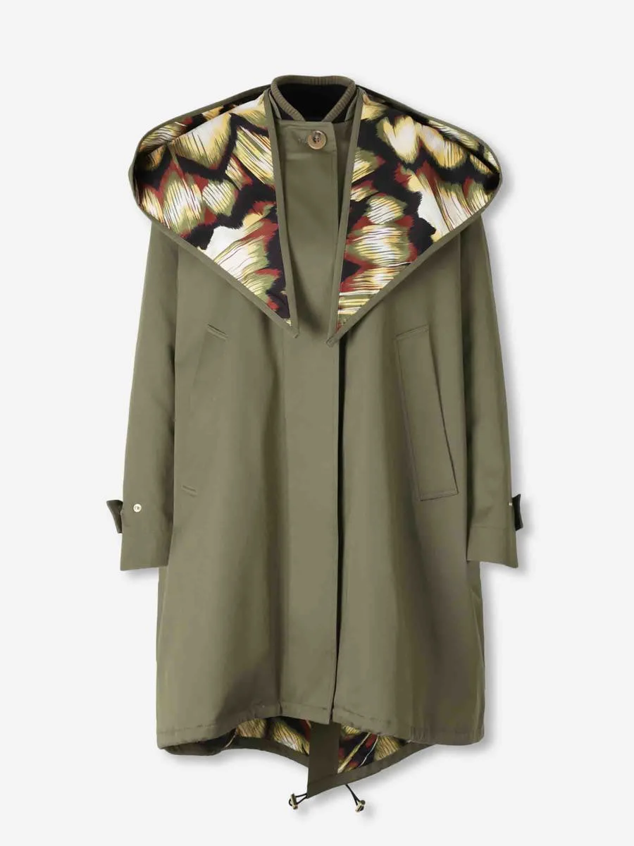 Windsor ParkaType of article By LaDoubleJ• Two side pockets with zipper• Cuffs with snap buttons and adjustable hem• Made from high-quality cotton• Printed lining• Front closure with buttons• Round neck with removable printed scarf at the neckComposition: 97% cotton 3% elastaneItaly Gender: Women Material: 97% COTTON 3% ELASTANE Color: MILITARY GREEN Made in: Italy Product ID: JAC0160_COT081SOLID_GR12SOLID *Import tax/duty will be calculated at checkout (If applicable)