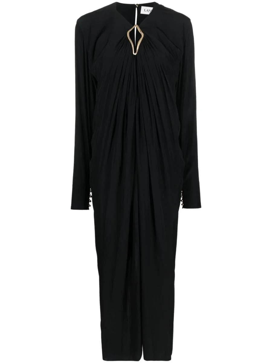 cut-out midi dress from Lanvin featuring black, gold-tone hardware, cut-out detailing, gathered detailing, V-neck, long sleeves, buttoned cuffs, rear slit and calf-length. Gender: Women Material: POLYESTER 100% Color: BLACK Made in: FR Product ID: RW DR0025 4778 H23 10 *Import tax/duty will be calculated at checkout (If applicable)