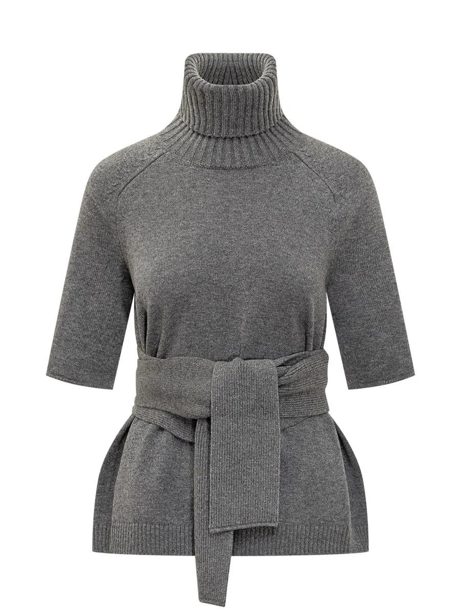 Gray wool sweater with high collar, short sleeves and tone-on-tone knit belt. A versatile and elegant garment. Gender: Women Material: 79% WOOL, 19% CASHMERE, 1% ELASTANEE, 1% POLYAMIDE Color: GREY Made in: Italy Product ID: RWPO0015K065H25 150 *Import tax/duty will be calculated at checkout (If applicable)
