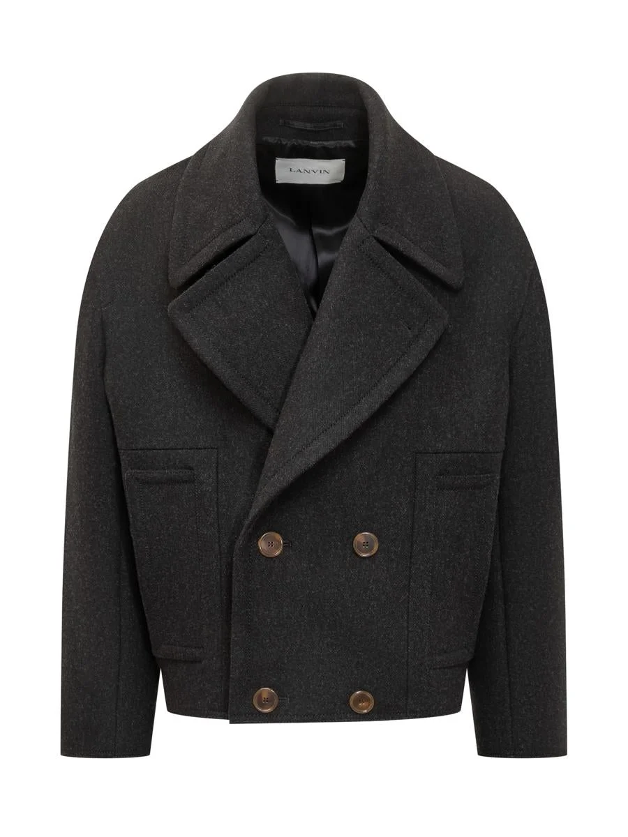 Black wool peacoat Lanvin short coat with double-breasted closure and wide lapels. Gender: Men Material: OUTSIDE:100% VIRGIN WOOL LINING:65% ACETATE, 35% VISCOSE Color: Black Made in: Italy Product ID: RMCO00096120H25 18 *Import tax/duty will be calculated at checkout (If applicable)