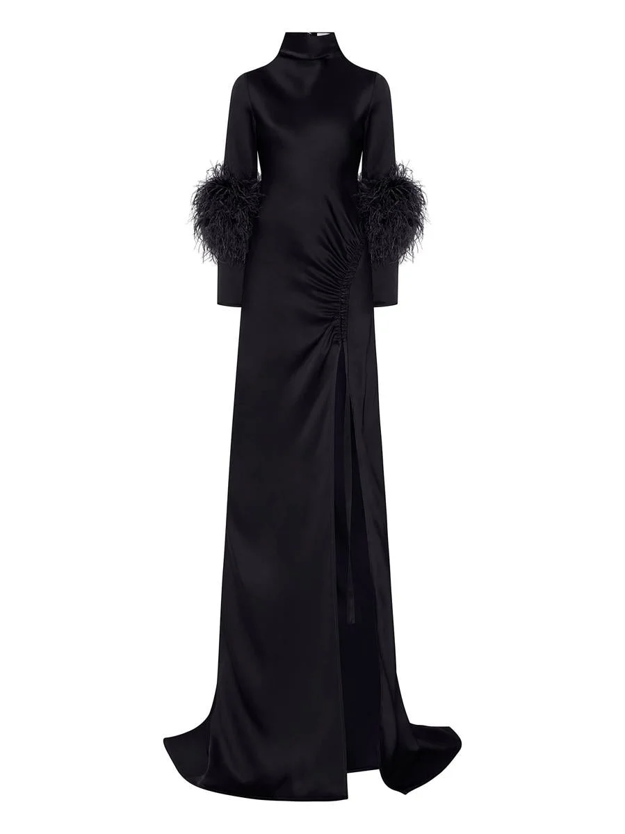 Concealed zip closure on the back High neck; Long sleeves Tone-on-tone feathers on the sleeves Gathered side tab Side slit Floor-length Color: Black 61% acetate, 39% viscose, 100% Struthio Camelus Made in the USA Gender: Women Material: 61% ACETATE, 39% VISCOSE Color: Black Made in: Imported Product ID: R3253085AJA001 *Import tax/duty will be calculated at checkout (If applicable)