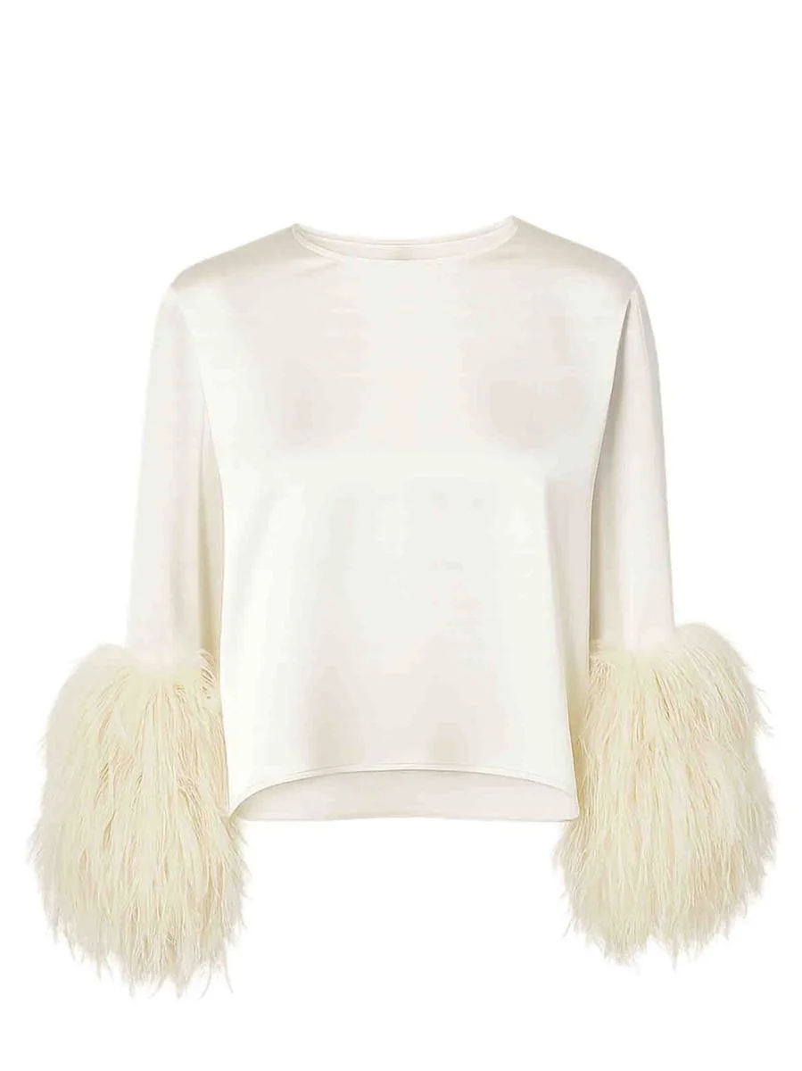 Crew neck Long sleeves Ostrich feathers at the cuffs Straight fit Color: cream 61% acetate, 39% viscose Made in the USA Gender: Women Material: 61% ACETATE, 39% VISCOSAA Color: Beige Made in: Imported Product ID: R3242266AJA102 *Import tax/duty will be calculated at checkout (If applicable)