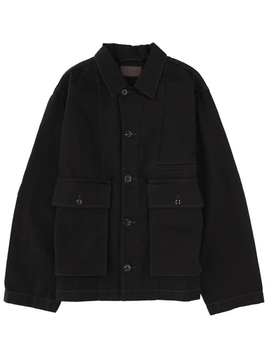 This boxy jacket is an iconic unisex piece in Lemaire's workwear wardrobe. It's made from thick denim, an emblematic material of the house, in a deep black wash. The models are 177 cm and 187 cm and are wearing sizes 36 (S) and 48 (M). This boxy jacket is an iconic unisex piece in Lemaire's workwear wardrobe. It's made from thick denim, an emblematic material of the house, in a deep black wash. The models are 177 cm and 187 cm and are wearing sizes 36 (S) and 48 (M). DETAILS Boxy jacket in heavy black denim Oversized cut Shirt collar Front button closure Long sleeves Straight buttoned cuffs Welted chest pocket Gusseted pockets with button flaps and side openings Side button tabs Interior Lemaire embossed leather label Contrast topstitching Made in Morocco Style : OW1198 LD1055 Boxy jacket in heavy black denim Oversized cut Shirt collar Front button closure Long sleeves Straight buttoned cuffs Welted chest pocket Gusseted pockets with button flaps and side openings Side button tabs Interior Lemaire embossed leather label Contrast topstitching Made in Morocco Style : OW1198 LD1055 CARE Main Material: 100% Cotton Jacron: 100% Cow Leather Soft wash 30° Do not bleach Do not tumble dry Cool ironing Soft dry clean Wash upside down Main Material: 100% Cotton Jacron: 100% Cow Leather Soft wash 30° Do not bleach Do not tumble dry Cool ironing Soft dry clean Wash upside down