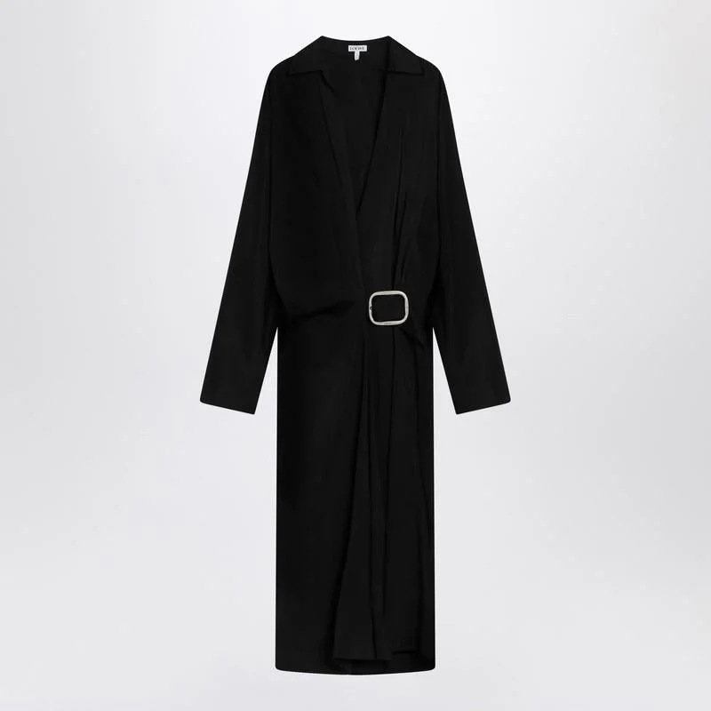 Black viscose chemise dress from Loewe featuring a V-neck, an adjustable waistband with logo buckle, long sleeves and draped front. Gender: Women Material: Fabric I: 96% Viscose - 4% Elastane / Fabric II: 100% Cotton Color: Black Made in: Italy Product ID: S359Y09XH2VI/Q_LOEW-1100 *Import tax/duty will be calculated at checkout (If applicable)
