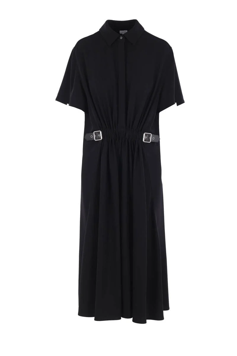 Loewe midi dress crafted from black stretch viscose. Featuring a pointed collar, hidden front button closure, short sleeves, waist draping with adjustable belted straps, and a flared skirt. Gender: Women Material: EXTERIOR: 5.0% VACUNO-CALF SKIN 91.28% VISCOSE-VISCOSE 3.72% ELASTANO-ELASTANE INTERIOR: 100.0% POLYESTER-POLYESTER Color: Black Made in: Italy Product ID: S540Y09XTW1100 *Import tax/duty will be calculated at checkout (If applicable)