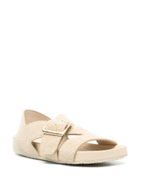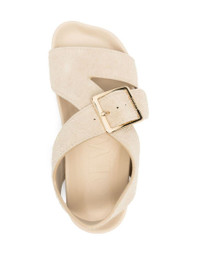 cream white calf suede square open toe crossover strap at the toe branded leather insole rubber sole gold-tone hardware side buckle fastening with logo-engraved buckle Heel 1 in / 2,5 cm; Platform 0,8 in / 2 cm Gender: Women Material: FURS & SKINS->CALF LEATHER100 % Color: WHITE Made in: IT Product ID: L814465X768806 *Import tax/duty will be calculated at checkout (If applicable)