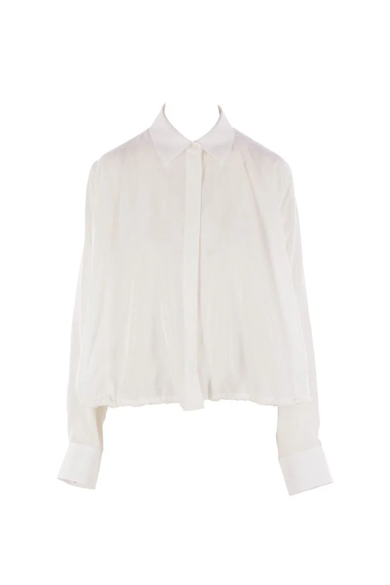 Loewe cropped shirt crafted from white silk, featuring Anagram embroidery on the left cuff. It has a classic collar, a concealed front button closure, long sleeves with buttoned cuffs, and a balloon hem with a drawstring. Gender: Women Material: EXTERIOR: 96.0% SEDA-SILK 4.0% VISCOSE-VISCOSE Color: WHITE Made in: Italy Product ID: S359Y05XET2100 *Import tax/duty will be calculated at checkout (If applicable)