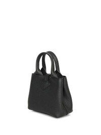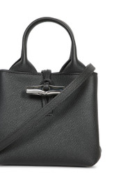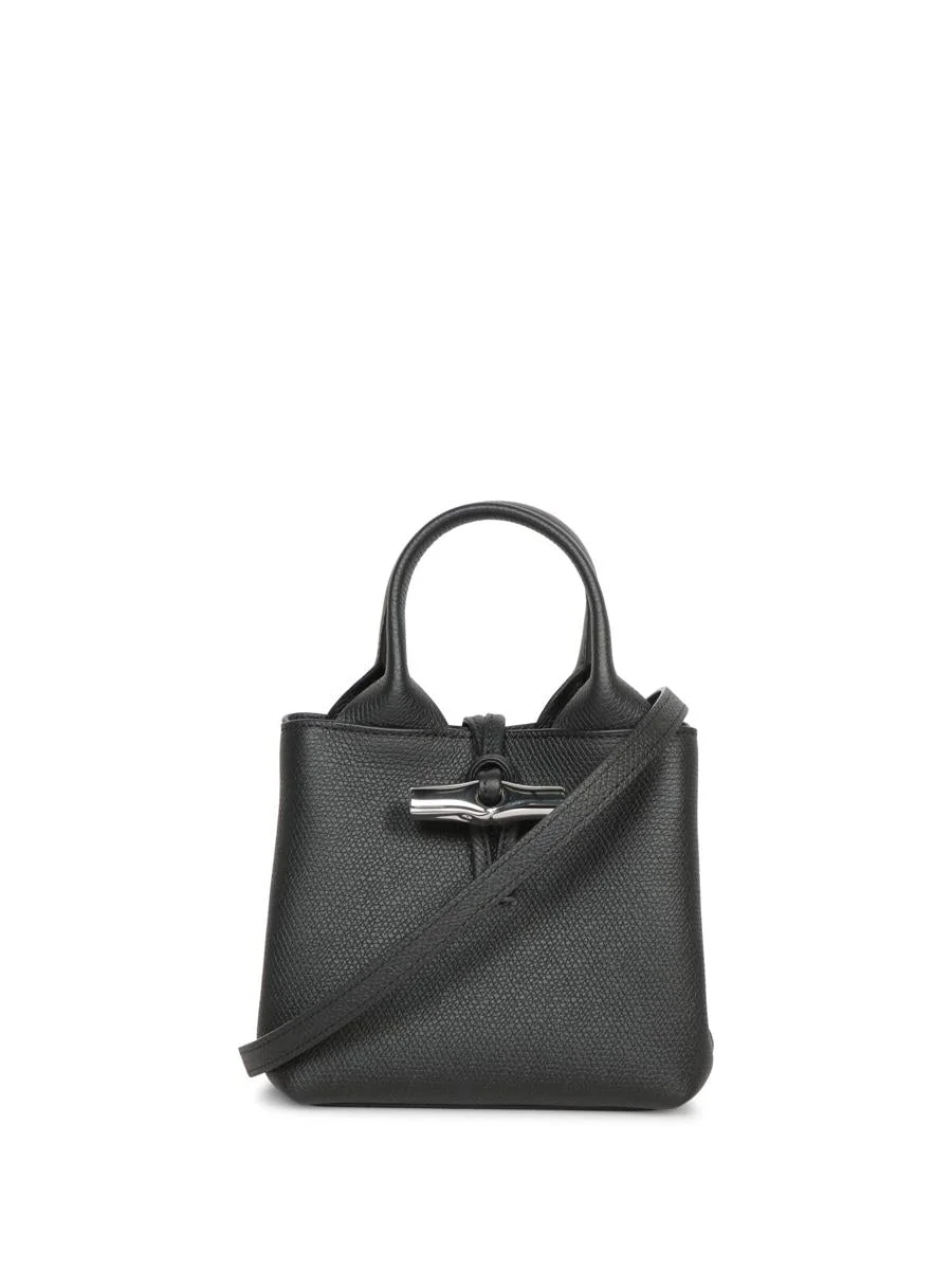 The XS Le Roseau handbag by Longchamp is made of hammered leather and features a classic metal bamboo closure. The interior is lined with logo fabric and includes a zip pocket and two leather credit card slots. It also has an adjustable and removable shoulder strap, as well as side snap buttons for compression. The metallic accessories have a silver finish. Bag length: 15 cm Bag height: 14 cm Bag weight: 8,5 cm Handle height: 8,5 cm Gender: Women Material: 100% COWHIDE Color: Black Made in: IMPORTED Product ID: 10278HFP 001 *Import tax/duty will be calculated at checkout (If applicable)