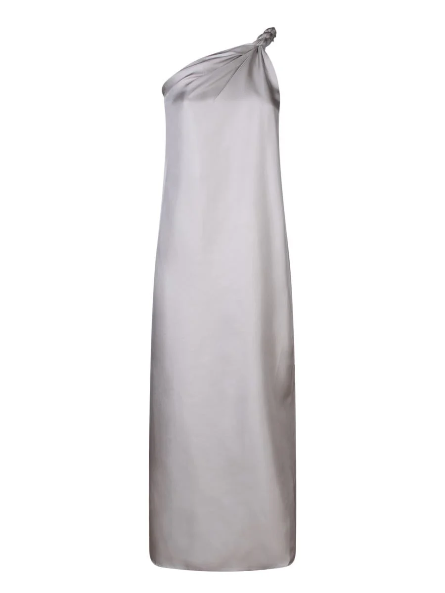 One-shoulder design. Silk fabric. Long, flowing cut. Uniform grey color. The essence of refined simplicity is embodied in this Loulou Studio pearl grey silk one-shoulder dress, featuring a soft drape that accentuates its volume and fluidity. Gender: Women Material: 100% SILK Color: GREY Made in: Imported Product ID: ADELA 100% SILK SILVER GRE *Import tax/duty will be calculated at checkout (If applicable)