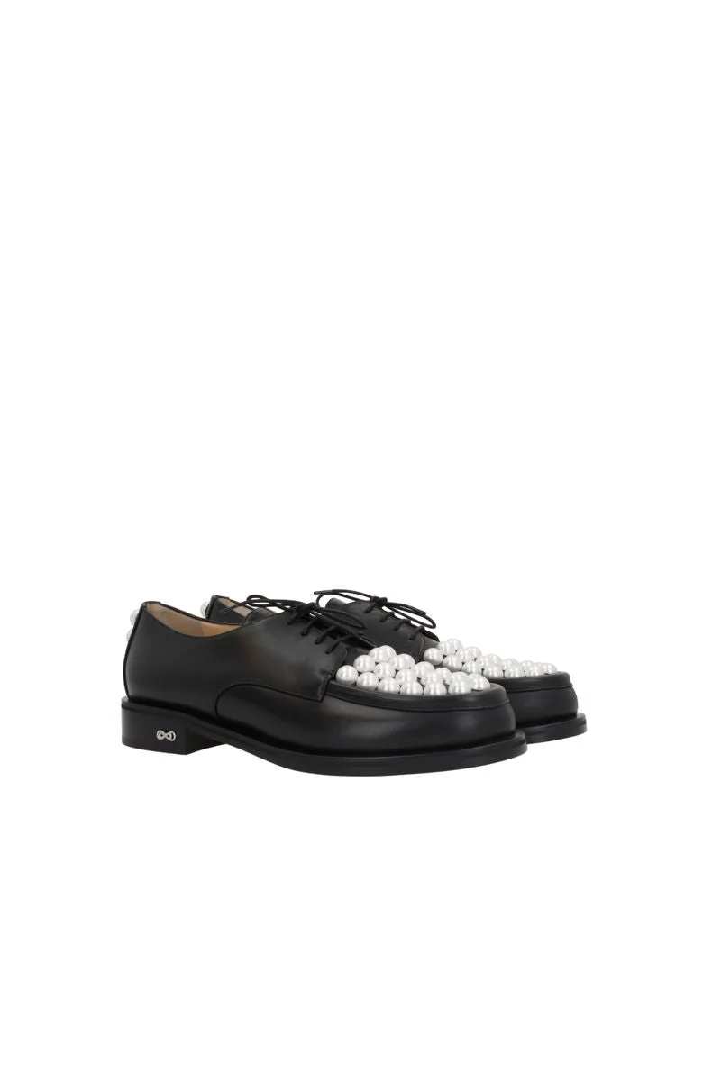 Lace-up loafers by Mach & Mach crafted in smooth black leather and adorned with synthetic pearls. Featuring lace-up closure, round toe, leather lining and leather sole. Gender: WOMEN Material: UPPER: 100% CALF LEATHER / LINING: 100% KID LEATHER / SOLE: 50% CALF LEATHER, 50% MICRO Color: BLACK Made in: IT Product ID: S076530CLFB02 *Import tax/duty will be calculated at checkout (If applicable)