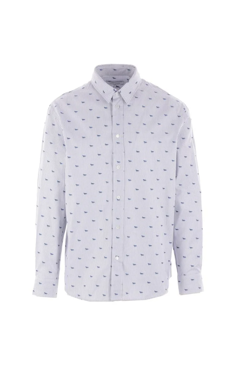 Maison Kitsune shirt crafted from white and grey cotton poplin with an all-over Profile Fox Stripe pattern. Featuring a pointed collar, front button closure, long sleeves with buttoned cuffs and a rounded hem. Gender: Men Material: MONOENSEMBLE = 100% COTTON Color: ZINC GREY STRIPE Made in: LT Product ID: MM00408WC50460192 *Import tax/duty will be calculated at checkout (If applicable)