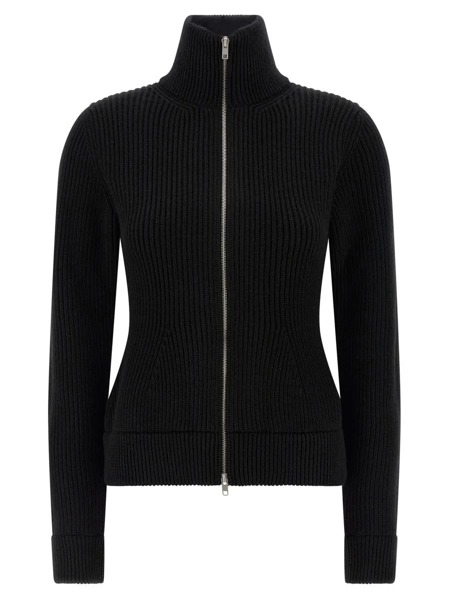 Knitted virgin wool cardigan, high neck, front zip closure, long cuffed sleeves, back 'Four stitches' Gender: Women Material: 100% VIRGIN WOOL Color: Black Made in: Italy Product ID: S29HP0039M13181900 *Import tax/duty will be calculated at checkout (If applicable)