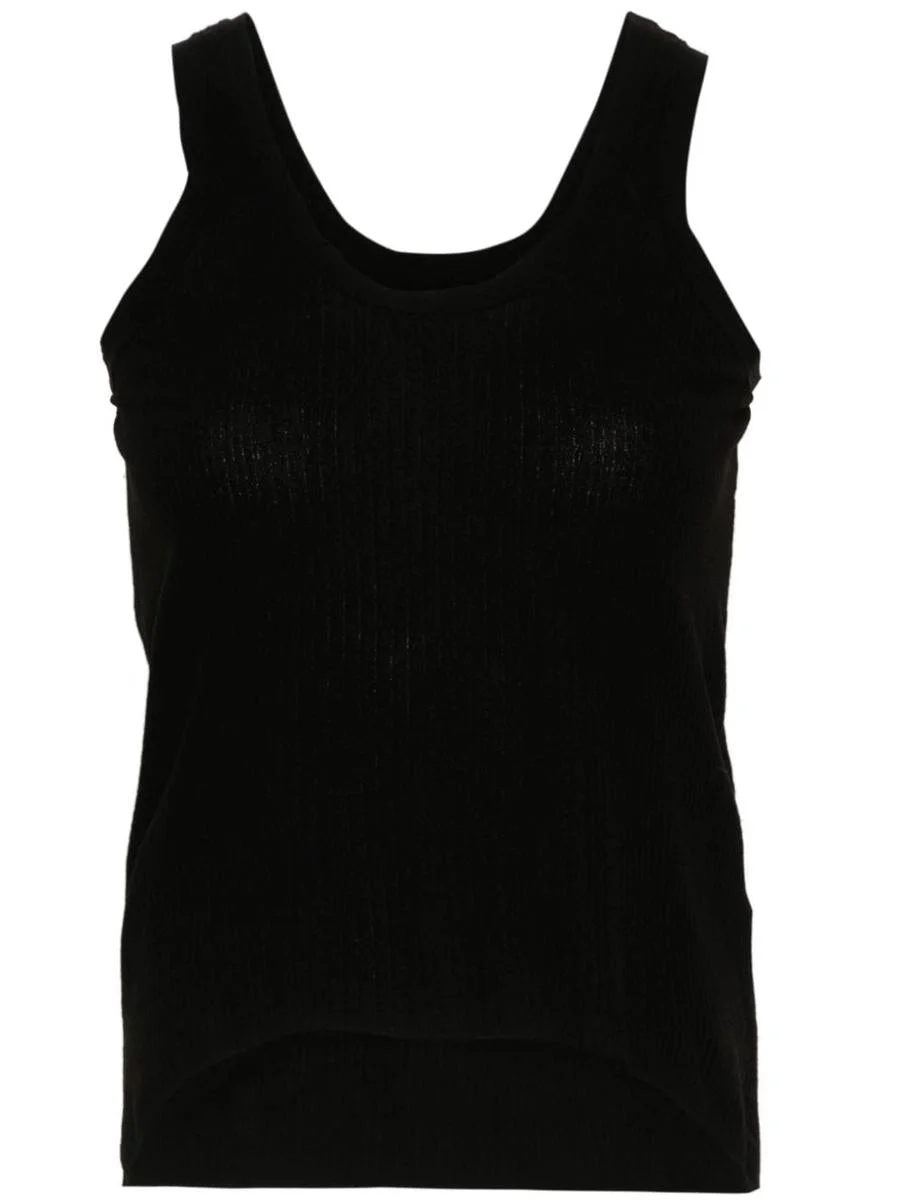 Highlights black stretch-design fine ribbed lightweight round neck thin straps sleeveless signature four-stitch logo high-low hem pull-on style Gender: Women Material: TESSUTO PRIMARIO: 88% POLYAMIDE 12% ELASTANE Color: Black Made in: Imported Product ID: S29NL0059M13006 900 BLACK *Import tax/duty will be calculated at checkout (If applicable)