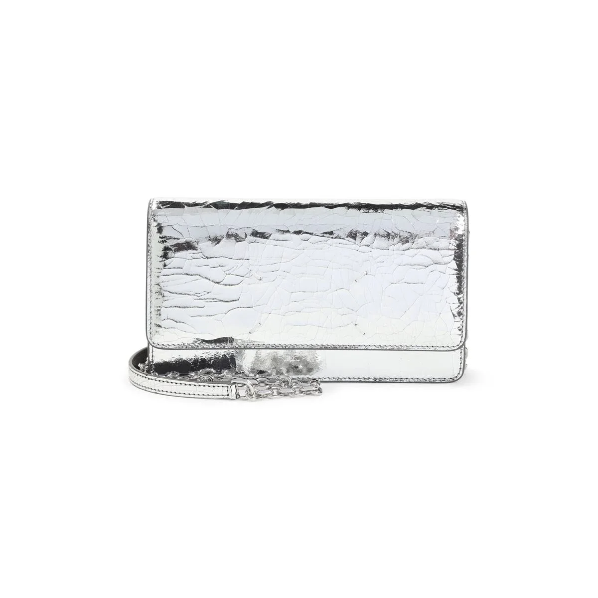 Maison Margiela Silver Cracked Leather Fold Over Bag. Silver Cracked Leather, fold-over design, magnetic snap fastening, zipped pocket, six credit card slots and detachable chain shoulder strap. Logo details, fully lined. Measures: W:19,5cm H:11cm D:4cm Gender: Women Material: 100%CALF LEATHER Color: GREY Made in: Italy Product ID: SA3UI0018.P5016_7730 *Import tax/duty will be calculated at checkout (If applicable)