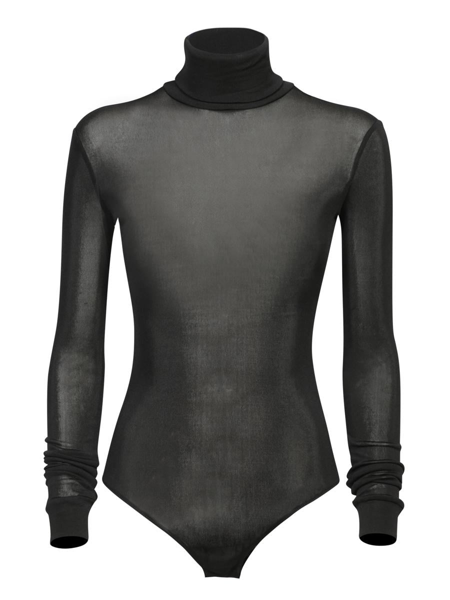 Long sleeve bodysuit with high collar. Pleated details on the sleeves. Stretch fabric. This sleek Maison Margiela black bodysuit stands out with its sophisticated high-neck design and gathered sleeves that add a dimension of refined texture, perfect for a distinctive evening look. Gender: Women Material: 66% VISCOSE 34% POLYAMIDE Color: Black Made in: Imported Product ID: S51NA0104 S24468 900 *Import tax/duty will be calculated at checkout (If applicable)