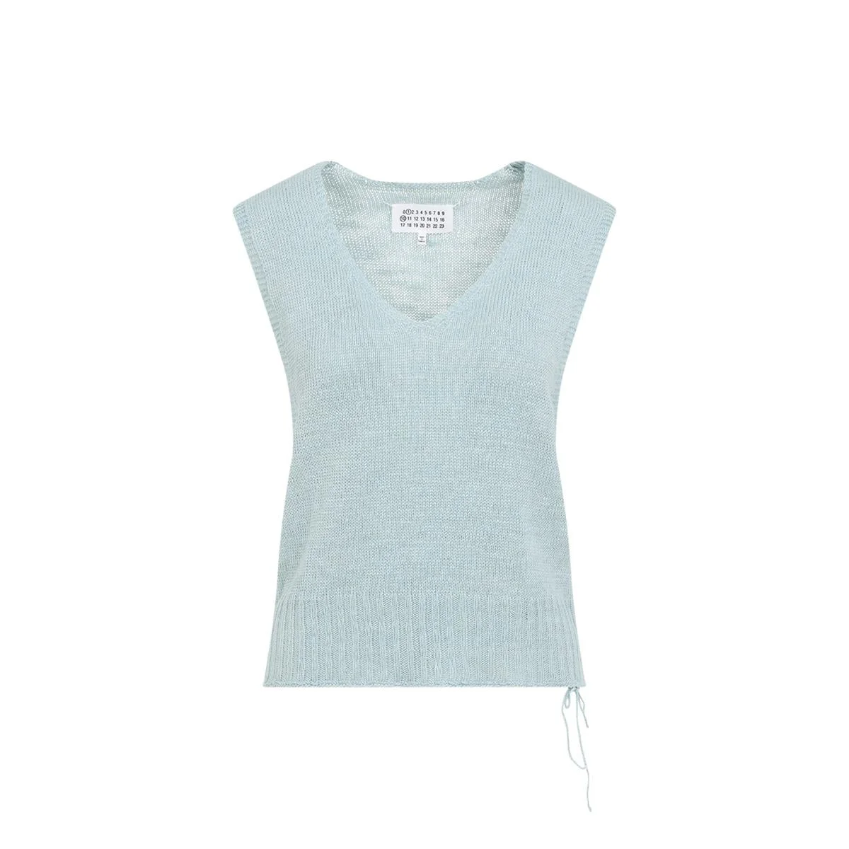 Maison Margiela Light Blue True Hemp Vest. Pure light blue true hemp vest, v-neck, back signature white stitching, sleeveless, ribbed hem, straight hem, side tonal adjustable strap. Gender: Women Material: 100%TRUE HEMP Color: BLUE Made in: ROMANIA|RO Product ID: S51FB0078.M13099_545 *Import tax/duty will be calculated at checkout (If applicable)