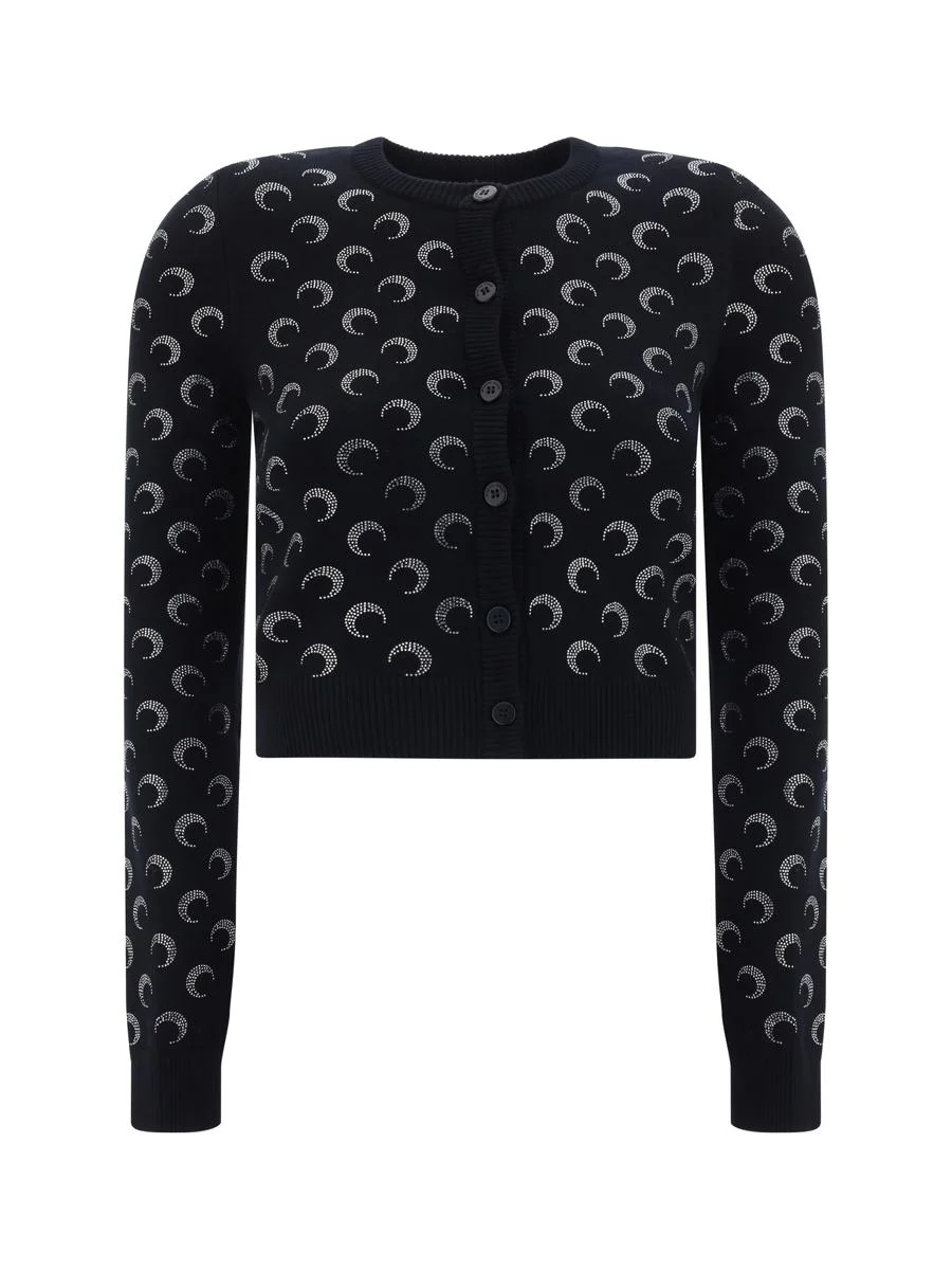 CARDIGAN FROM MARINE SERRE, RIBBED CREW NECK, BUTTON FRONT CLOSURE, RIBBED HEM, RIBBED CUFFS, ICONIC ALL-OVER CONTRASTING BRAND LOGO, SLIM FIT. STANDARD Gender: Women Material: VISCOSE | ELASTANE Color: Black Made in: BG Product ID: WTK011ARKNI0001_BK99 *Import tax/duty will be calculated at checkout (If applicable)