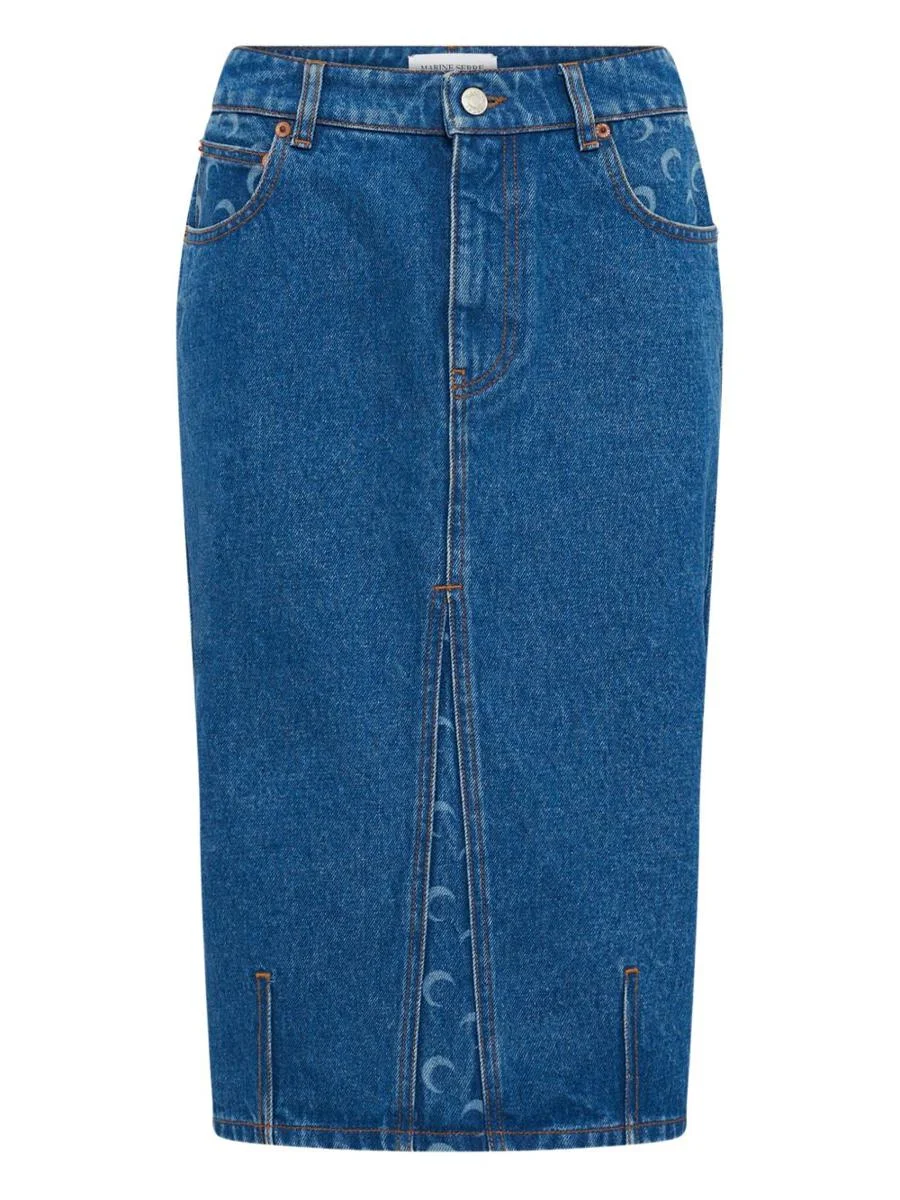 Marine Serre Moon Laser denim midi skirt Features Light blue Front button closure Crescent moon motif Side slit Midi length Gender: Women Material: BASEMATERIAL: 100% COTTON Color: BLUE Made in: Italy Product ID: WSK126ACDEN0002BL05 *Import tax/duty will be calculated at checkout (If applicable)