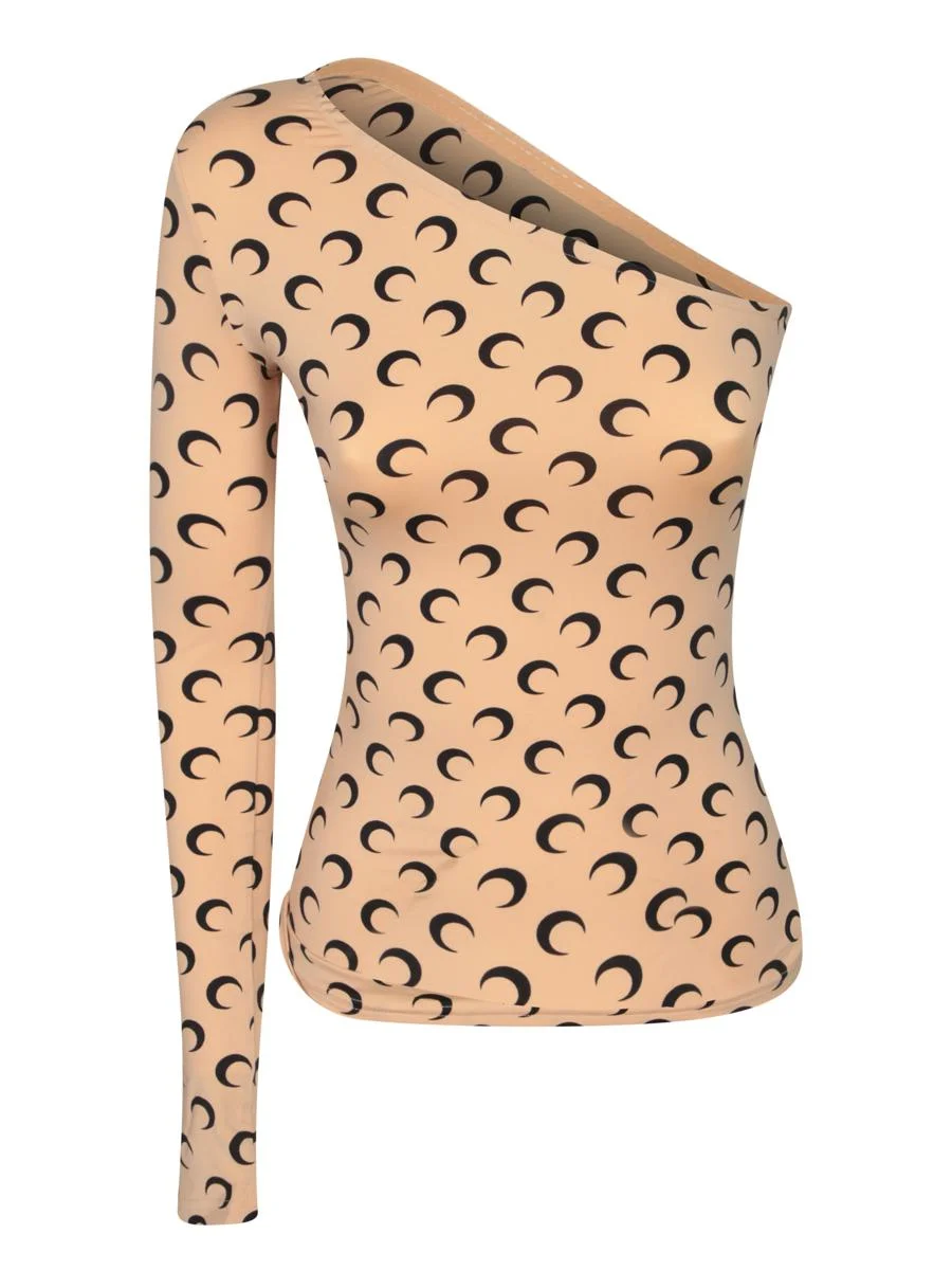 Long sleeve top. Asymmetric design with one exposed shoulder. All-over crescent moon print.. Explore uniqueness with the Marine Serre 'Moon Beige' Asymmetric Top, featuring a bold one-shoulder design and adorned with the iconic crescent moon print, perfect for a standout look Gender: Women Material: 88% POLYAMIDE, 12% ELASTANE Color: Beige Made in: Imported Product ID: WTS014A CJER0001 TA10 *Import tax/duty will be calculated at checkout (If applicable)