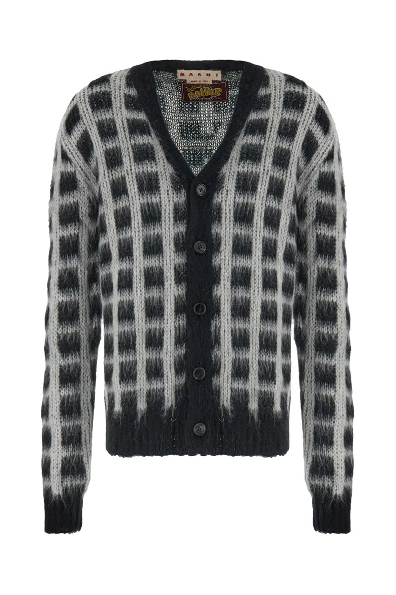 Marni cardigan crafted in soft brushed mohair-wool-blend yarn with check pattern all-over. It features V neck, front button closure and ribbed trims. Regular fit. Gender: MEN Material: 39% ACETATE 33% POLYAMIDE 28% MOHAIR Color: BLACK Made in: IT Product ID: CDMG0115Q0UFU161 CHN99 *Import tax/duty will be calculated at checkout (If applicable)