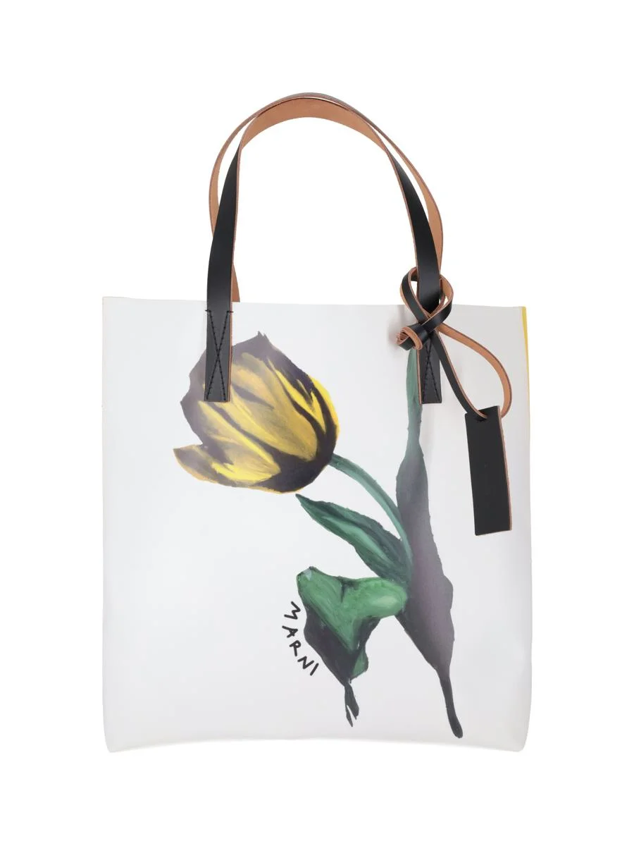 WHITE AND YELLOW FABRIC TRIBECA TOTE WITH TULIP PRINT