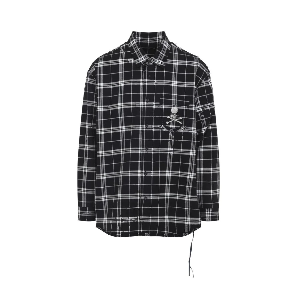 Mastermind World Black Plaid Cotton Reversible Raw Edge Plaid Shirt. Pure cotton shirt, pointed neck, front buttoned fastening, chest patch pocket with white embroidered skull, back beige lettering logo, long sleeves, buttoned cuffs, round hem, side strap. Gender: Men Material: 100%COTTON Color: Black Made in: Imported Product ID: MW25S15SH007.026_ *Import tax/duty will be calculated at checkout (If applicable)