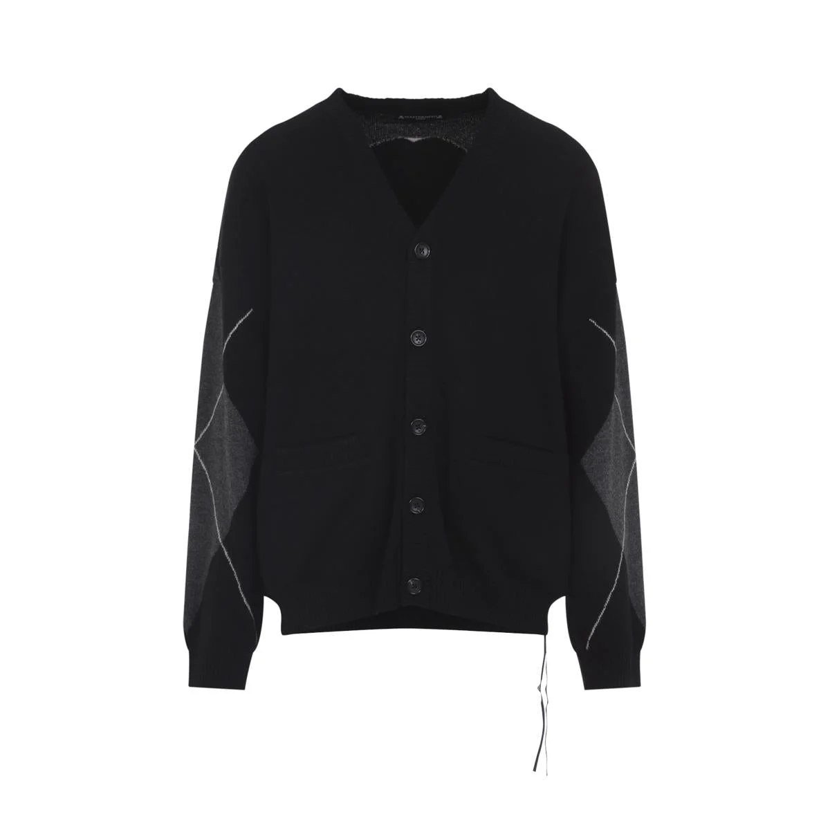 Mastermind World Black Cashmere Argyle Cardigan. Pure black cashmere cardigan, v-neck, front buttoned fastening, back skull design, long sleeves, ribbed cuffs and hem, side tonal strap, straight hem. Diamond grey design on the sleeves. Gender: Men Material: 100%CASHMERE Color: Black Made in: Imported Product ID: MW25S15KN003.100_ *Import tax/duty will be calculated at checkout (If applicable)