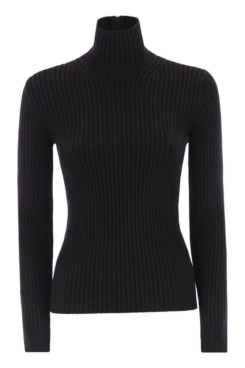Turtleneck jumper in stretch wool and cashmere yarn, featuring a ribbed knit that highlights the silhouette. - Slim fit - High neck - Long sleeves - Half zip at the back of the neck with customised enamelled slider DESIGNER ID: 2521366293600 007 Gender: Women Material: 66% WOOL, 28% CASHMERE, 5% POLYAMIDE, 1% ELASTANE Color: Black Made in: Italy Product ID: 2521366293600 007 *Import tax/duty will be calculated at checkout (If applicable)