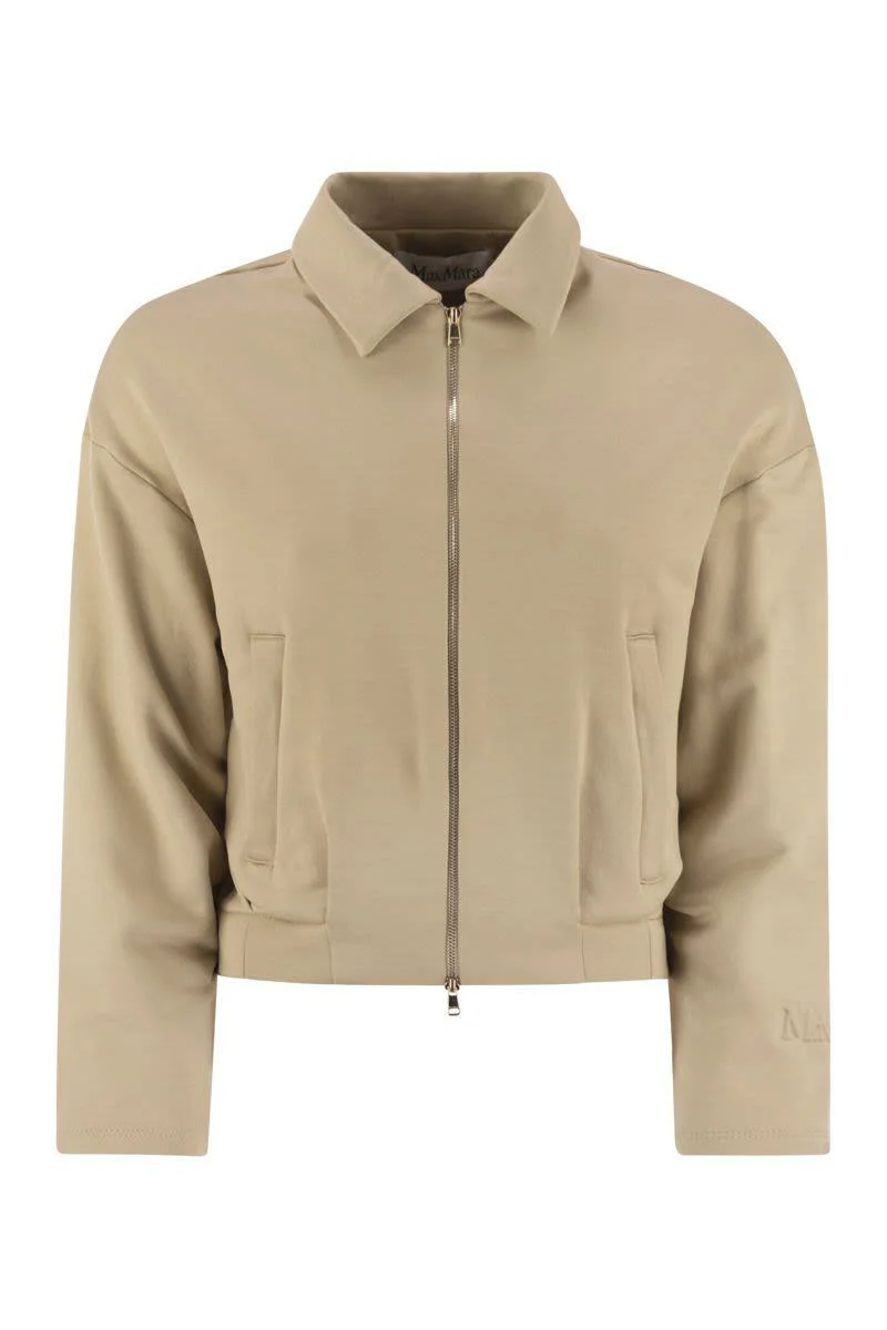 Long-sleeved crop sweatshirt in silk and cotton with dropped shoulders, gathered detail on the inside and embossed Max Mara logo on the left sleeve. - Soft fit - Shirt collar - Front closure with double-slider zip - Slash pockets with zip - Pleated detail at the waist on the front and back DESIGNER ID: 2521926018600 003 Gender: Women Material: 55% SILK, 43% COTTON, 2% ELASTANE Color: Brown Made in: Italy Product ID: 2521926018600 003 *Import tax/duty will be calculated at checkout (If applicable)