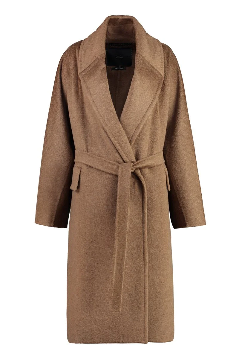 Attuale oversize belted coat Lapel collar Coordinated waist belt Two side pockets 39% Camel, 2% Wool, 59% Cashmere Gender: Women Material: CASHMERE Color: BROWN Made in: IT Product ID: ATTUALE2421016025600_003 *Import tax/duty will be calculated at checkout (If applicable)