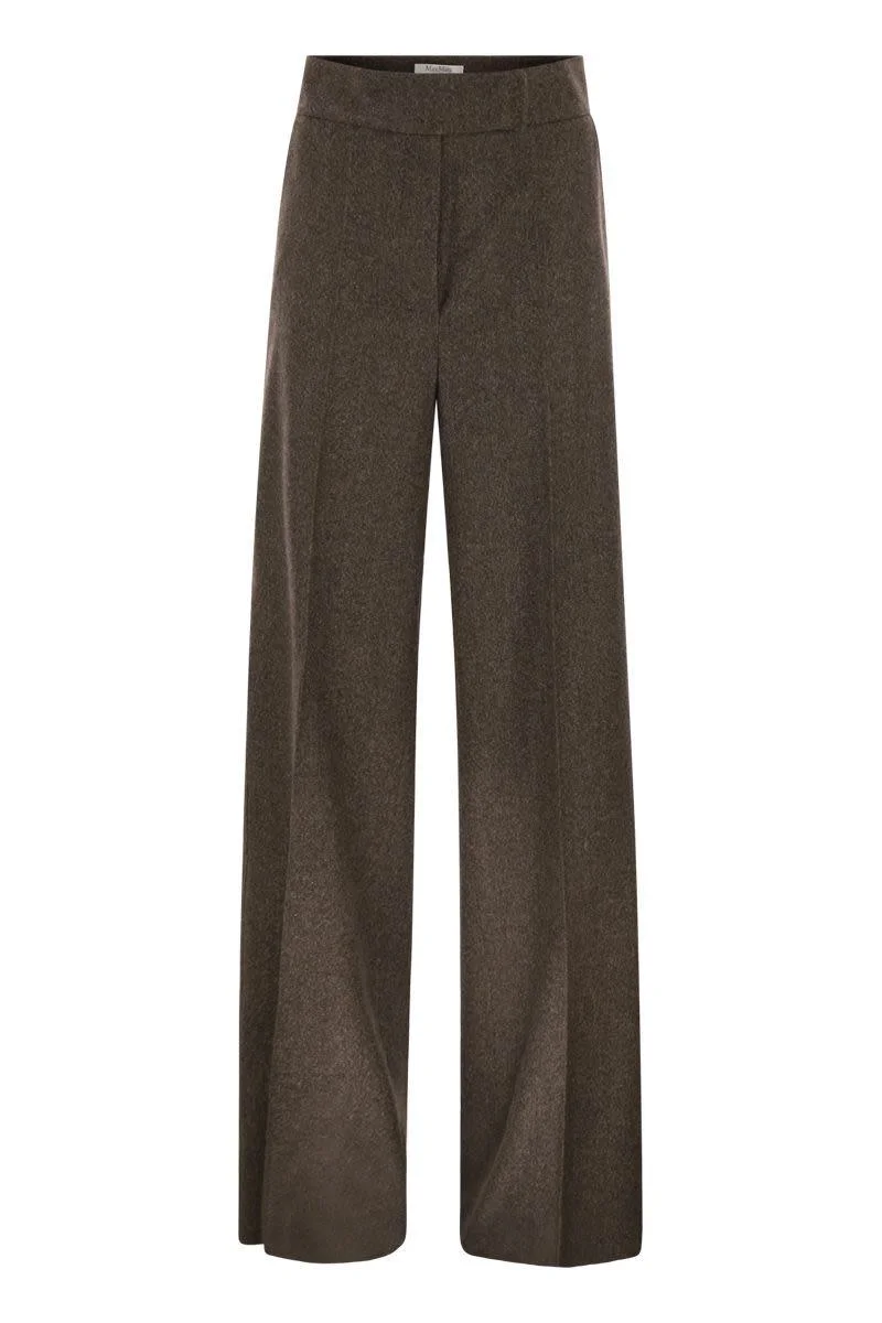 Wide-leg trousers in pure wool yarn-dyed flannel, featuring a tailored high-waisted construction. - Wide leg - High waistband closure with zip fly and hook fastening - Side pockets - Slash pockets on the back - Pressed crease and stitched darts at the back waist - Lined DESIGNER ID: 2521136323600 001 Gender: Women Material: 100% VIRGIN WOOL Color: BROWN Made in: Italy Product ID: 2521136323600 001 *Import tax/duty will be calculated at checkout (If applicable)