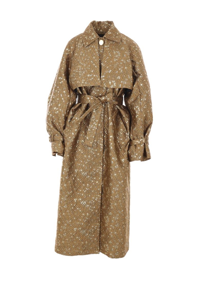 Max Mara Atelier oversized trench coat made of gold jacquard with a mosaic effect. Featuring a pointed collar, front closure with snap buttons, matching belt, welt pockets, long sleeves with belted cuffs, storm flap, central vent and a lined interior. Gender: Women Material: 92% POLYESTER, 06% METALLISED FIBER, 02% POLYAMIDE Color: Gold Made in: IT Product ID: 2421016115699001 *Import tax/duty will be calculated at checkout (If applicable)