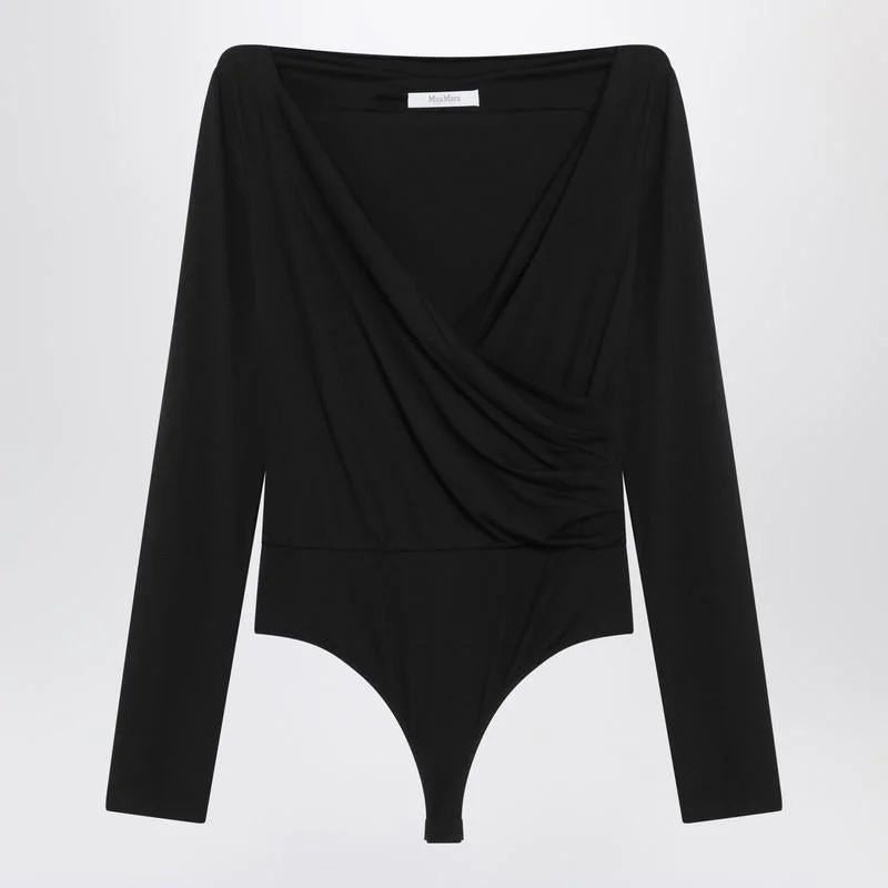 Bodysuit by Max Mara in black viscose stretch jersey, featuring long sleeves and crossover V-neckline. Gender: Women Material: 96% Viscose - 4% Elastane Color: Black Made in: Italy Product ID: CICLADIVI/R_MAXM-008 *Import tax/duty will be calculated at checkout (If applicable)