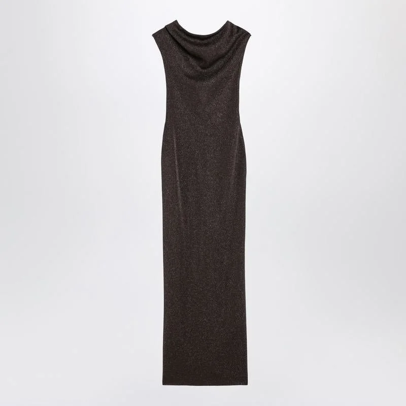 Long sleeveless dress by Max Mara Pianoforte in brown viscose and lurex yarn, characterized by a V-neckline at the back with crossed straps, fitted silhouette, straight skirt, and unlined design. Gender: Women Material: 20% Viscose - 20% Metallic fibber Color: BROWN Made in: Romania Product ID: ESCHIMOVI/R_MAXMP-001 *Import tax/duty will be calculated at checkout (If applicable)