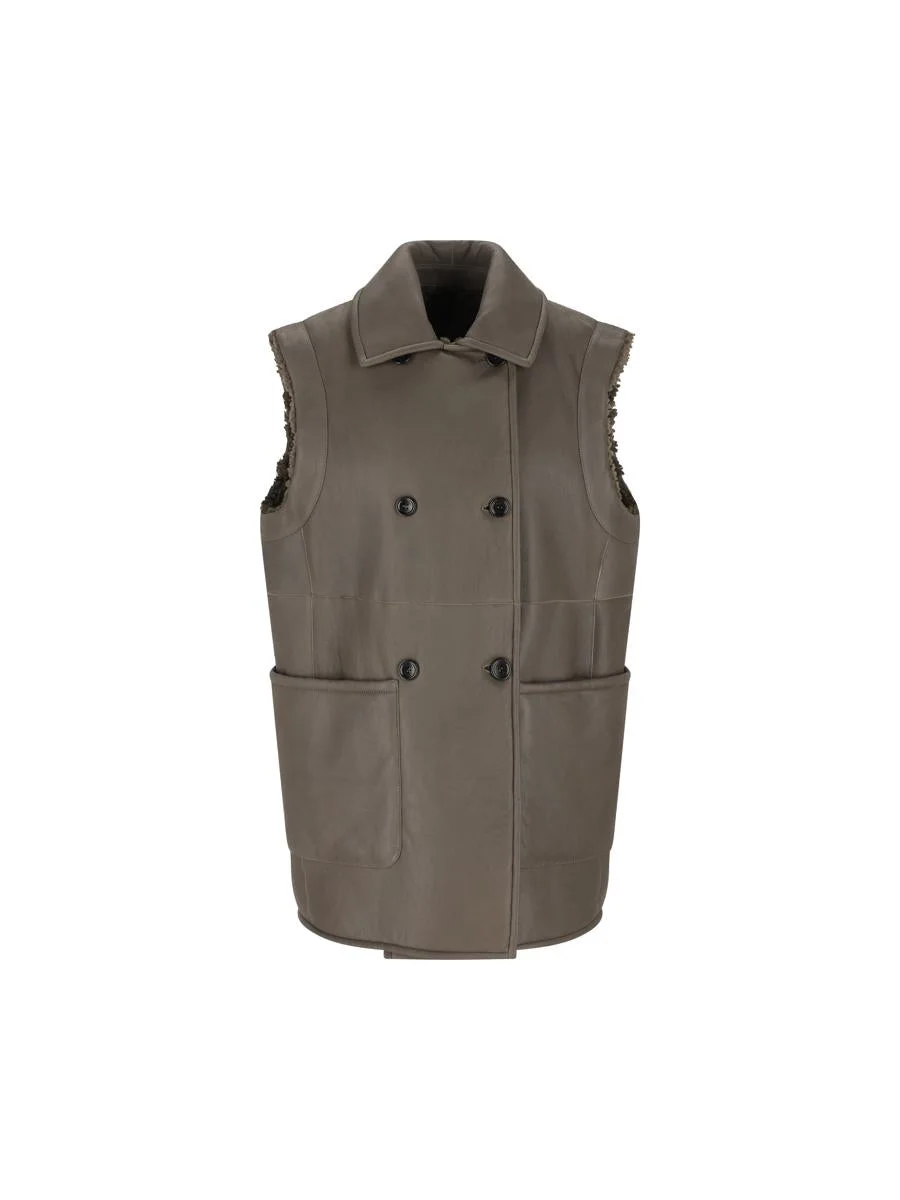 Max Mara's shearling vest interprets the house's elegance through essential lines and fine materials. The double-breasted silhouette with shirt collar combines sartorial style and warmth, while the sheepskin fabrication lends softness and a luxurious look. A versatile and sophisticated garment, perfect for enhancing your winter wardrobe with a distinctive detail. - Material: sheepskin - Color: green - Shirt-style collar - Double-breasted button closure - Front patch pockets - Item number: 2521416053600003 Gender: Women Material: RAM OVIS ARIES ARIES SPAIN Color: MOSS GREEN Made in: Romania Product ID: 2521416053600003_AI25 *Import tax/duty will be calculated at checkout (If applicable)