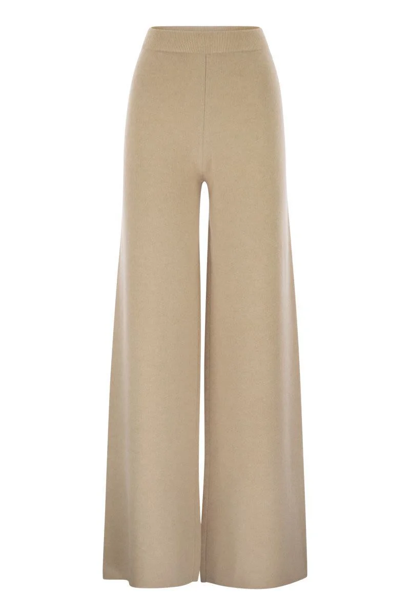 Long trousers in wool and cashmere yarn with a cloth stitch. - Straight cut - Ribbed elasticated waistband - Pleats sewn into the back of the waistband - Logo tag at the centre back of the waistband DESIGNER ID: 2521336012600 006 Gender: Women Material: 70% WOOL, 30% CASHMERE Color: Beige Made in: Italy Product ID: 2521336012600 006 *Import tax/duty will be calculated at checkout (If applicable)