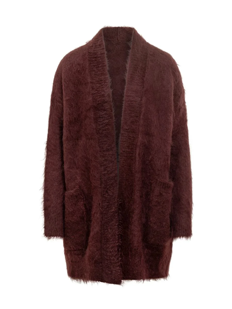 Max Mara cardigan in burgundy-colored plush-effect yarn. Open oversize model with front pockets and loose fit. Gender: Women Material: 67% MOHAIR , 30% POLYAMIDE, 3% WOOL Color: RED Made in: Italy Product ID: 2521346073600 003 *Import tax/duty will be calculated at checkout (If applicable)