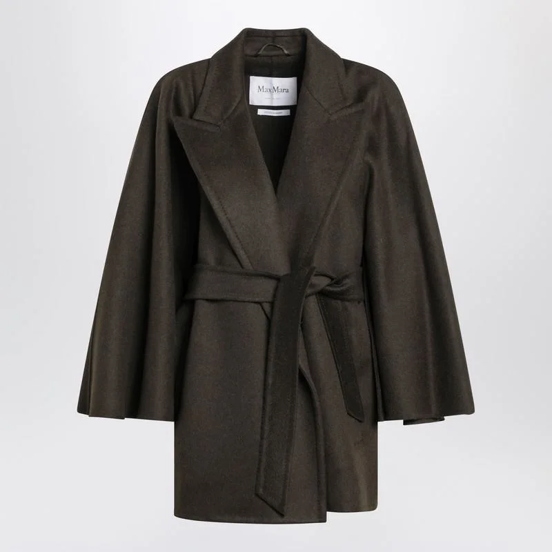Short wrap coat by Max Mara in moss green camel drap, featuring underarm slit, oversized cut, peak lapels, raglan sleeves, matching waist belt, side welt pockets, and unlined design. Gender: Women Material: 100% Camel Color: GREEN Made in: Italy Product ID: VERNAWO/R_MAXM-007 *Import tax/duty will be calculated at checkout (If applicable)