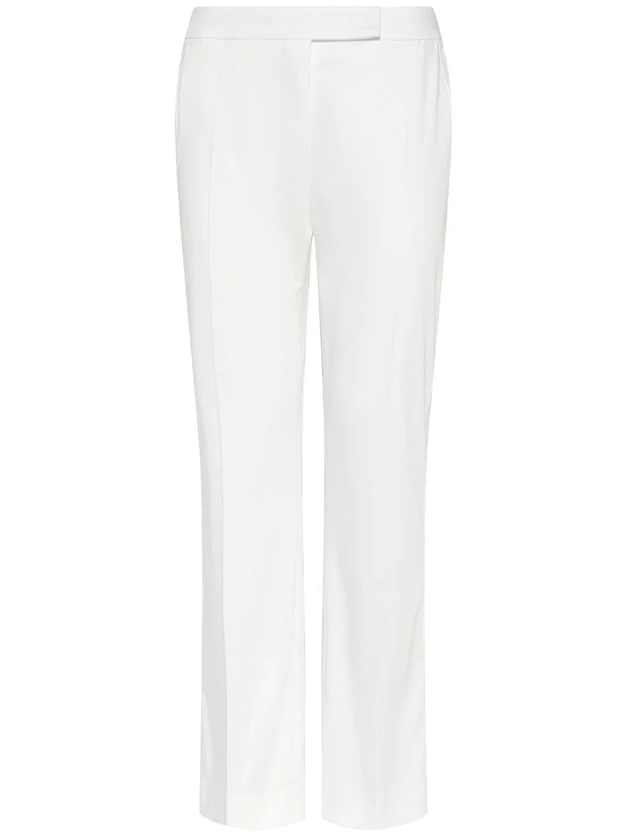 Trousers in stretch cotton satin, featuring a straight silhouette slightly narrower and cropped at the ankle. Featuring a trouser crease and slant pockets at the sides. Fastening with a wide waistband tab, zip fly and small hook.   Composition Cotton 98%, Elastane 2% Gender: Women Material: 98% COTTON, 02% ELASTANE Color: WHITE Made in: Imported Product ID: 2511131072600OKRA 056 WHITE *Import tax/duty will be calculated at checkout (If applicable)